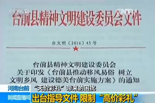 2016年年底,河南省臺前縣下發《臺前縣農村紅白事標準參照指導意見(征求意見稿)》等文件,對農村彩禮提出了參照標準,要求彩禮總數控制在6萬元以內。