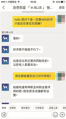 一家名為“自然而藍”的店鋪主營服裝類商品,北青報記者以顧客身份進行詢問,客服稱,買家發出的好評率要在98%以上,才可以在店中購買。“好評率不夠就不行了,這也是店主和主管共同制定的,以防有人惡意攻擊。”客服人員稱,目前有很多家店鋪都有類似設置,“因為有種行當叫職業差評師,所以很多家店鋪都會設置,只是標準不一樣,算是不成文的規矩。”