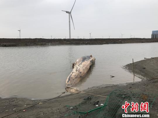 22日一早,中新網記者抵達位處浦東大治河附近的現場時,殞命鯨魚已在岸上,據稱,凌晨4時左右,此間漁政部門借助漲潮,將鯨魚拖上岸。