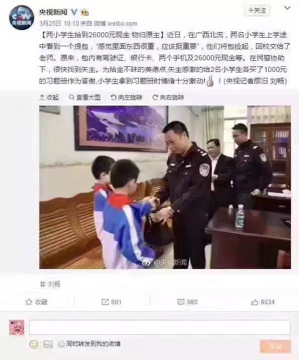 (原標題:失主回贈撿錢小學生1000元習題冊!?這張圖刷屏了!然而央視微博卻回應… )