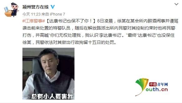 中國青年網北京4月10日電 據微博認證為“安徽省阜陽市潁州公安分局”的賬號@潁州警方在線發布消息稱,8日凌晨,徐某在某會所內醉酒鬧事并謾罵襲擊前來處置的特警隊員,隨后在解放路派出所內民警對其控制約束時他將民警打傷,并高喊“你們無權處理我,我認識‘李達康書記’。”