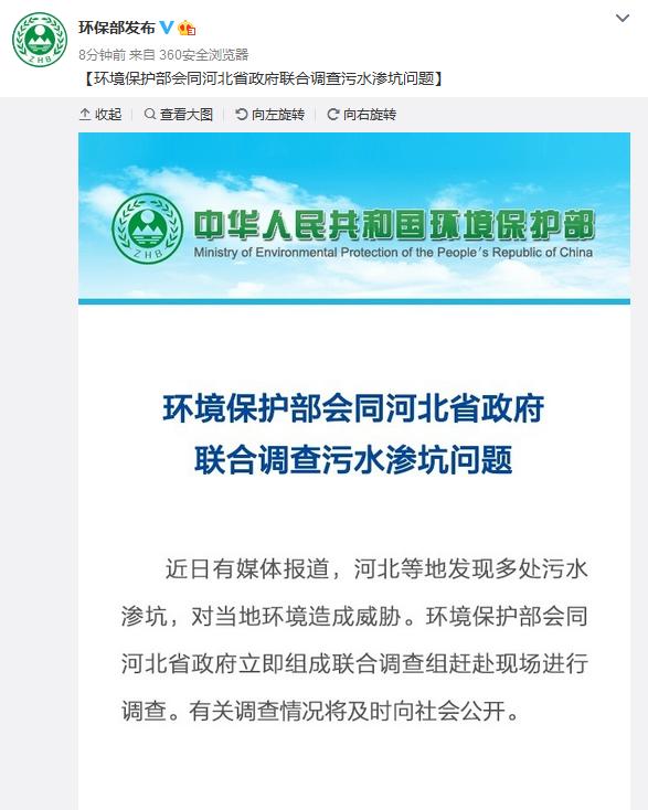央廣網(wǎng)北京4月19日消息 據(jù)環(huán)境保護部宣傳教育司官方微博消息,近日有媒體報道,河北等地發(fā)現(xiàn)多處污水滲坑,對當?shù)丨h(huán)境造成威脅。環(huán)保部會同河北省政府已成立聯(lián)合調(diào)查組趕赴現(xiàn)場進行調(diào)查。