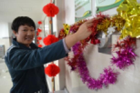 呂迎春參加監獄文藝匯演演出布置。山東省女子監獄供圖
