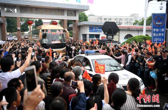 6月5日上午,安徽毛坦廠中學考生出發,萬余民眾冒雨相送。8時08分,28輛大巴車從毛坦廠校園緩緩開出,毛坦廠鎮過萬民眾夾道歡送。 中新社記者 韓蘇原 攝
