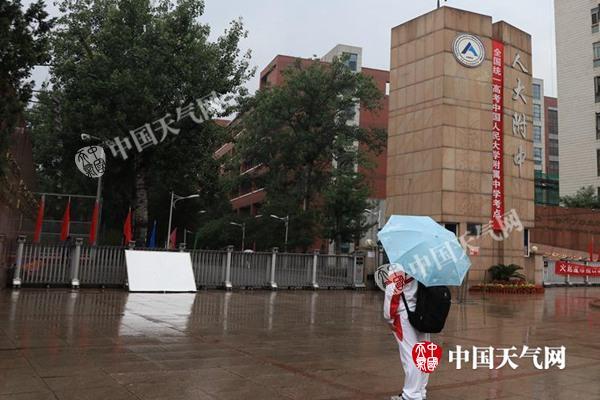 6日清早,北京下起小雨,考生冒雨熟悉考場。(圖/李琛)