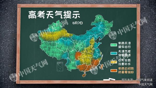 今天是2017年高考的第一天,全國雨水整體較弱,以小到中雨為主,早晨吉林、黑龍江以及華南等地可能出現(xiàn)降雨,建議考生稍微早點出門。今天白天陜西、江南、華南等局地有中到大雨,還可能出現(xiàn)短時強降水、雷暴大風等強對流天氣。中央氣象臺預計,新疆北部、陜西中部、云南東南部、江南東南部、華南中東部、海南島等地有中到大雨,局地有暴雨。