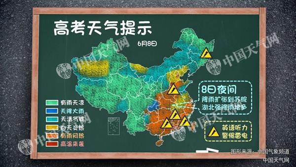 高考期間,陜西南部、華北南部和黃淮中西部可能出現(xiàn)雷電、大風等強對流天氣,提醒考生和家長們一定要注意防范降雨以及雷電、大風等強對流天氣的不利影響;此外8日夜間至9日白天四川盆地至江淮一帶有強降雨,部分地區(qū)發(fā)生地質(zhì)災(zāi)害的氣象風險較高,需注意防范降雨可能引發(fā)的滑坡、泥石流等災(zāi)害。