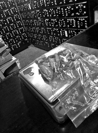 隨后,北青報記者來到望京附近的一家藥店,店員向北青報記者推薦了一服中藥,其中含有10克穿山甲片,并稱也可以單獨購買穿山甲片,但是要10克起賣,137.5元10克。店員從藥柜中取出一個透明的自封袋,里面裝有三分之一的穿山甲片,北青報記者問這袋有多重時,店員隨即將這袋穿山甲片放在電子秤上,電子秤顯示共129克,“我們進貨都是1公斤的,賣到現在只剩這么多了”。