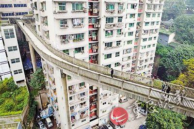 微博上曾有一組照片顯示渝中區(qū)一處天橋,橋的一端從地面連接到另一棟樓的13層。該微博發(fā)出后,引發(fā)了網(wǎng)友對該天橋所在地的各種猜想。