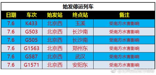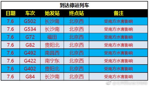中新網(wǎng)7月6日電 據(jù)北京西站官方微博消息,受湖南、湖北部分地區(qū)持續(xù)強(qiáng)降雨影響,北京西站多部列車停運(yùn)。據(jù)通知顯示,停運(yùn)的多為往來武漢、長沙、貴陽等受水害嚴(yán)重地區(qū)列車。