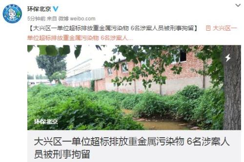 中新網7月7日電 據北京市環境保護局微博消息,北京大興區一單位超標排放重金屬污染物,6名涉案人員被刑事拘留。