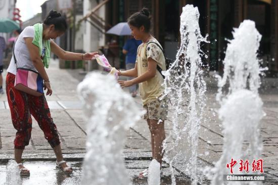 7月25日,市民在南京街頭的噴泉處戲水覓清涼。 中新社記者 泱波 攝