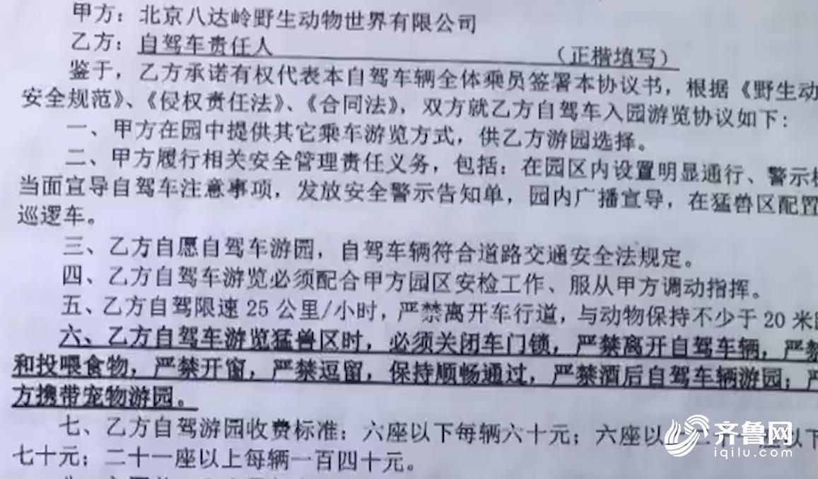 這份《自駕車入園車損責(zé)任協(xié)議書》也被網(wǎng)友戲稱為生死契,里面第4條黑體加粗的明確寫明嚴禁開窗、嚴禁喂食、嚴禁逗留,同時協(xié)議書的第十條也寫明,甲乙雙方有違上訴協(xié)議內(nèi)容,各自承擔(dān)相關(guān)責(zé)任。動物園方面表示,如果不簽署這份協(xié)議,是沒有辦法進園游覽的。