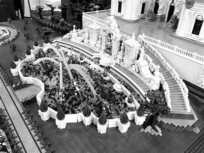 10月20日,“大水法”模型制作團(tuán)隊(duì)的負(fù)責(zé)人王先生告訴北青報(bào)記者,他們是從今年開始籌備用積木復(fù)原圓明園這一項(xiàng)目的,耗時(shí)半年,目前已經(jīng)完成觀水法、大水法、遠(yuǎn)瀛觀部分的搭建,共使用了約66萬塊積木,模型沙盤所占面積為4.47平方米。