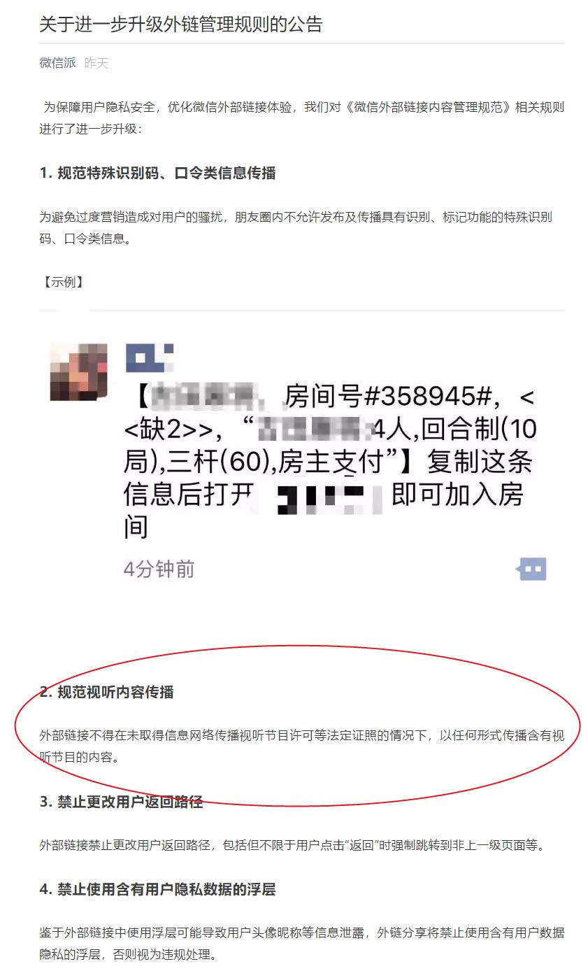 5月18日,騰訊官方發(fā)布公告,進一步限制了外部鏈接在微信內(nèi)傳播。在這則名為《關(guān)于進一步升級外鏈管理規(guī)則的公告》中,明確提出“外部鏈接不得在未取得信息網(wǎng)絡(luò)傳播視聽節(jié)目許可等法定證照的情況下,以任何形式傳播含有視聽節(jié)目的內(nèi)容”。