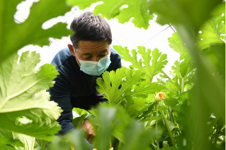 2020年3月19日,甘肅省平?jīng)鍪袥艽ǹh涇明鄉(xiāng)白家村黨支部書記白寧安在村里的日光溫室內(nèi)勞作。新華社記者 陳斌/攝