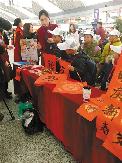 雙流機(jī)場(chǎng)工作人員帶“小候鳥”們寫福字