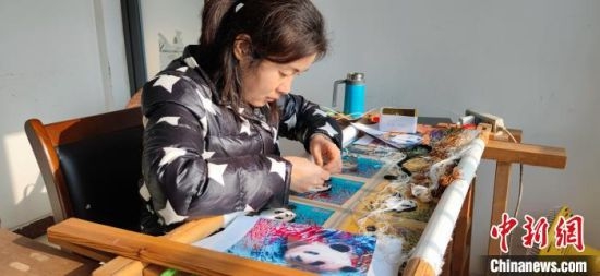 1月17日,位于成都高新區的蜀菁館工作室內,幾位繡娘正在刺繡。不大的工作室里,擺滿了蜀錦、蜀繡作品,其中多以大熊貓為主,均通過數字圖片處理技術設計,這也是“AI新錦繡”與傳統蜀繡最大的區別。