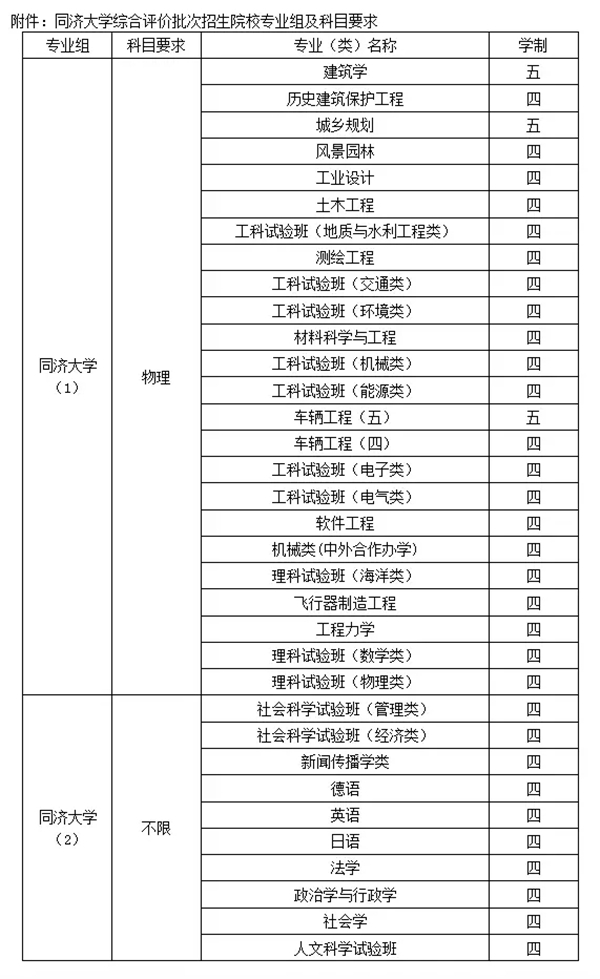 同濟大學綜合評價批次招生院校專業(yè)組及科目要求