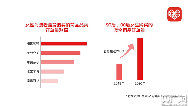 央廣網上海3月8日消息(記者傅聞捷)3月8日,拼多多發布“新電商·新女性消費報告”(以下簡稱“報告”),通過平臺數據分析及問卷調查等形式,展示了女性消費的新趨勢:90后、00后女生年訂單量占比過半,成新一代消費者中的主力軍;“悅己”支出大幅攀升,女裝、美妝等產品訂單量,增幅顯著高于其他產品;逛國潮、買國貨成為女性消費新風尚;年輕群體習慣晚間拼單,“熬得越晚,花得越多”。