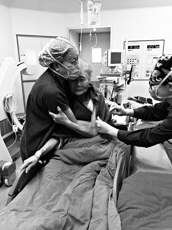 老人一開(kāi)始不愿說(shuō)話,我們能看出她很害怕,就一直抱著她聊天,詢問(wèn)她家里的一些情況轉(zhuǎn)移注意力。麻醉師和家屬簽字后,我們又跟她說(shuō)了一些不讓她緊張的話,持續(xù)了半個(gè)多小時(shí),老人慢慢放松了下來(lái),也不說(shuō)疼了,這才愿意輕輕地平躺配合手術(shù)!拔覀兙褪菍⑿谋刃模恍南胫龊米约旱谋韭毠ぷ,平時(shí)也是這樣的!蓖瑒P麗一起擁抱老人的護(hù)士王東艷的話語(yǔ)平凡而樸實(shí)。