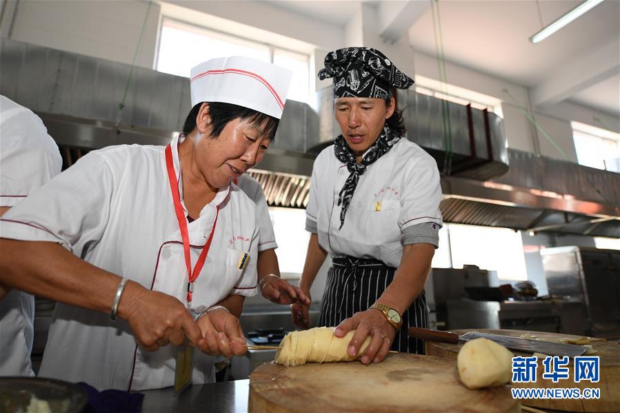 8月15日,嵐縣社科鄉陽坡村村民郭鳳英(左)在培訓教師郭群(右)的指導下制作土豆宴 山西省呂梁市嵐縣地處呂梁山北麓,日照充足,晝夜溫差大,種植土豆的條件得天獨厚,全縣土豆種植面積達到30萬畝,年產超過40萬噸。 近年來,嵐縣將土豆產業與土豆文化高度融合,打造了嵐縣土豆花、土豆宴、土豆種等多個品牌,闖出了一條特色土豆產業發展之路。 新華社記者楊晨光 攝 -