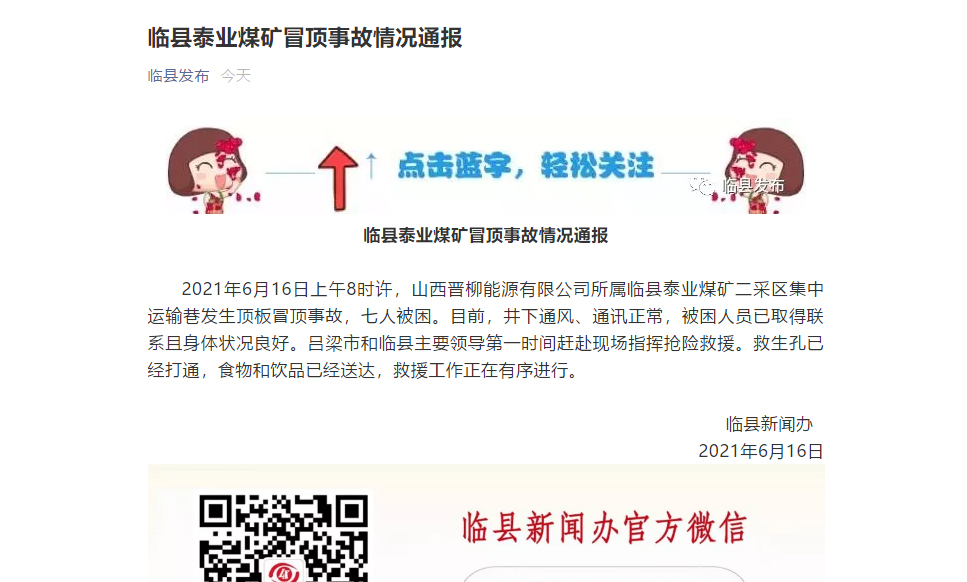 據(jù)山西省臨縣新聞辦6月16日消息,2021年6月16日上午8時(shí)許,山西晉柳能源有限公司所屬臨縣泰業(yè)煤礦二采區(qū)集中運(yùn)輸巷發(fā)生頂板冒頂事故,七人被困。