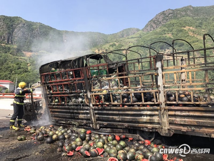 西部網訊(陜西廣播電視臺新聞中心記者李巖 宋潔 通訊員 屈亮)今天(6月27日)早上,福銀高速山陽段一輛拉滿西瓜的貨車發生大火,燒毀了車上拉的7噸多西瓜,所幸沒有人員傷亡。