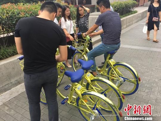 圖為民眾騎行“土豪金”共享單車。 燕武 攝