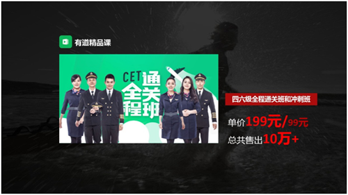 有道精品課今年推出了有道四六級全程班和沖刺班,只要花99或者199元,用戶就能體驗一站式的備考服務,性價比很高。這套課程,今年已經售出了超過10萬份。