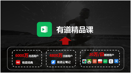 總體上,有道精品課的用戶,來源于有道的產品矩陣。有道詞典有6000萬的月活用戶,有道云筆記有4800萬的注冊用戶,有道的新產品矩陣每天有20萬的新增用戶。這些用戶都將給有道精品課導流。