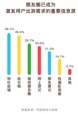 事實上,微信平臺不僅在用戶出游前的資訊獲取和出游過程的動態分享中扮演重要角色,而且對用戶的旅游購買決策也擁有較大的影響力。《報告》中來自同程旅游大數據的研究顯示,“特價促銷”、“放長假”和好友的朋友圈分享是影響人們旅游購買決策的三大因素。有相當一部分微信用戶在看到好友朋友圈分享的出游動態后萌生出游的想法,或者通過好友群等渠道獲取出游建議等信息。