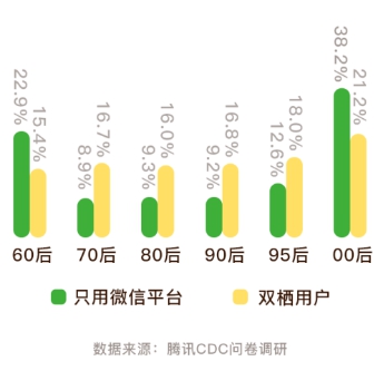鑒于微信平臺和旅游APP作為旅游產品購買渠道各有優劣,有相當一部分用戶選擇了兩個平臺都使用的策略。《報告》數據顯示,16.7%的受訪用戶屬于“雙棲用戶”,即微信平臺和旅游APP都使用過。交叉分析顯示,微信平臺用戶中有56.8%同時會使用旅游APP,旅游APP用戶中有19%會同時使用微信平臺。從用戶年齡層來看,“00后”群體只用微信平臺的比例相對最高,達到了38.2%。