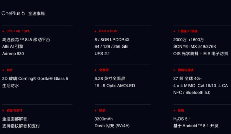 配置方面,一加手機6搭載高通驍龍?845移動平臺處理器,最高8GB RAM+256GB ROM存儲配置,采用玻璃機身搭配金屬中框的設計,正面一塊6.28 英寸全面屏,支持面部識別。