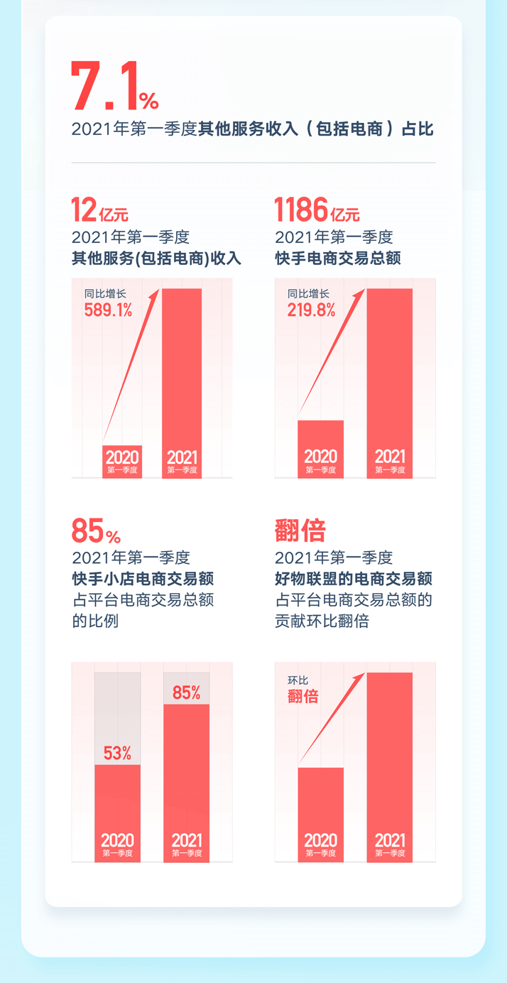 5月24日,快手科技(1024.HK)發(fā)布2021年第一季度財(cái)報(bào),電商業(yè)務(wù)增長(zhǎng)迅速。其中電商交易總額同比增長(zhǎng)219.8%達(dá)到人民幣1186億元,私域?qū)﹄娚探灰卓傤~的貢獻(xiàn)遠(yuǎn)超公域。以電商為主的其他服務(wù)收入板塊,同比大幅增長(zhǎng)589.1%至人民幣12億元。
