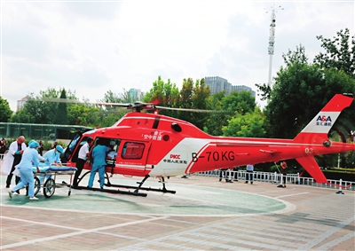 昨天上午,天津市人民醫(yī)院急診大樓門前,上演了一幕真實版的直升機(jī)救援“大片”。上午10點17分,一架印有PICC字樣的橘色直升機(jī)在眾人的驚呼和抓拍中,輕盈地降落在樓前空地上。但見幾名隨機(jī)醫(yī)護(hù)人員迅速從直升機(jī)上轉(zhuǎn)移一副帶有患者的擔(dān)架,正在值班的醫(yī)務(wù)處王一穎大夫等幾位醫(yī)護(hù)人員快步上前接過,一路小跑把患者推送至急診室。此次轉(zhuǎn)院救援服務(wù)是人保財險天津市分公司直升機(jī)救援項目啟動以來的首例救援行動,也是天津市第一起直升機(jī)救援案例,標(biāo)志著天津進(jìn)入空中救援新時代。
