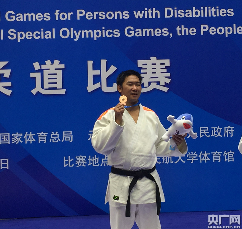 8月29日,在中國民航大學體育館的賽場中央,經歷了4分05秒的加時后,江西隊的馮斌與遼寧隊的齊計龍結束了全國第十屆殘運會暨第七屆特奧會盲人柔道男子81公斤級以上無差別級銅牌賽的爭奪。