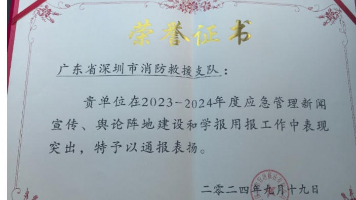 深圳消防連續(xù)四年榮獲“全國應(yīng)急管理新聞宣傳暨學報用報先進單位”稱號。
