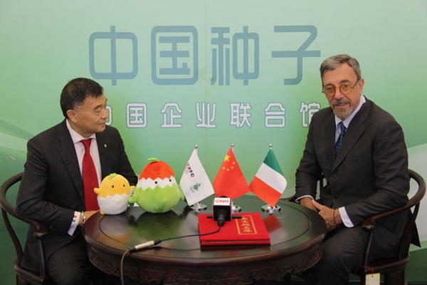 桑普多利亞足球俱樂部總經(jīng)理朱塞佩·阿爾貝加尼和中國(guó)企業(yè)聯(lián)合館副館長(zhǎng)朱裕華交談