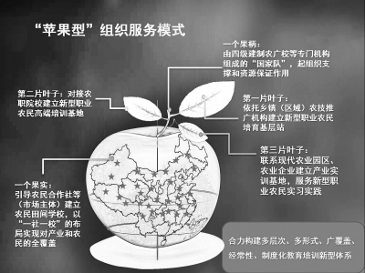 農民教育培訓最大的問題是組織問題,創新農民教育培訓模式,首先要創新農民教育培訓組織方式,有效破解教育培訓“低水平簡單重復”和“搞培訓不抓隊伍”問題。農廣校堅持開放的大體系觀,創新機制模式打造資源集合平臺,推進專門機構、相關資源和市場主體三種力量結盟,探索建立政府部門統籌領導下的新型職業農民教育培訓“蘋果型”組織服務方式。“一個果柄”是作為“國家隊”的專門機構。由中央、省、市、縣四級建制農廣校組成,起組織支撐和資源保證作用。“三片葉子”是相關資源的有序高效利用。“第一片葉子”是依托鄉鎮(區域)農技推廣機構建立新型職業農民培育基層站,將專門機構的組織支撐和資源保證作用進一步向鄉鎮(區域)延伸;“第二片葉子”是對接農職院校建立培養基地,提供新型職業農民高端培訓和高職教育;“第三片葉子”是聯系現代農業園區、農業企業建立產業實訓基地,服務新型職業農民實習實踐。“一個果實”是作為市場主體的新型農業經營主體。引導農民合作社等建立農民田間學校,以“一社一校”的布局實現對產業和農民的全覆蓋。“蘋果型”有機統一體,把政府部門的統籌主導職能、專門機構的支撐保證作用、相關資源的有序高效利用機制導入市場主體,共同培育和服務新型職業農民。