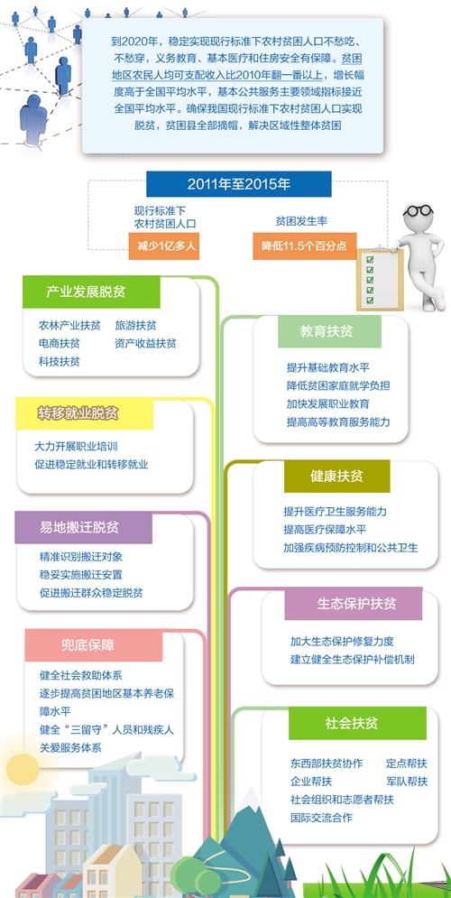 國家發(fā)改委地區(qū)司有關(guān)負(fù)責(zé)人介紹,《規(guī)劃》按照精準(zhǔn)扶貧精準(zhǔn)脫貧基本方略要求,因地制宜,分類施策,從8個(gè)方面實(shí)化細(xì)化了相關(guān)路徑和措施:一是產(chǎn)業(yè)發(fā)展脫貧,主要包括農(nóng)林產(chǎn)業(yè)扶貧、旅游扶貧、電商扶貧、科技扶貧等方面,提出了13項(xiàng)產(chǎn)業(yè)扶貧工程或具體措施;二是轉(zhuǎn)移就業(yè)脫貧,主要從組織開展職業(yè)培訓(xùn)和促進(jìn)轉(zhuǎn)移就業(yè)等方面,提出了6項(xiàng)就業(yè)扶貧行動(dòng);三是易地搬遷脫貧,對(duì)“一方水土養(yǎng)不起一方人”地區(qū)建檔立卡貧困人口實(shí)施易地扶貧搬遷,實(shí)現(xiàn)搬得出、穩(wěn)得住、能脫貧;四是教育扶貧,主要從基礎(chǔ)教育、職業(yè)教育和降低貧困家庭就學(xué)負(fù)擔(dān)等方面,提出了一系列行動(dòng)計(jì)劃和措施,不斷提升貧困人口綜合素質(zhì)和就業(yè)技能,逐步消除因?qū)W致貧問題,阻斷貧困代際傳遞;五是健康扶貧,主要從醫(yī)療衛(wèi)生服務(wù)、醫(yī)療保障、疾病防控和公共衛(wèi)生等方面,提出了6大健康扶貧工程,加快推進(jìn)基本公共衛(wèi)生服務(wù)均等化,有效緩解因病致貧返貧問題;六是生態(tài)保護(hù)扶貧,主要從生態(tài)保護(hù)修復(fù)、生態(tài)保護(hù)補(bǔ)償機(jī)制2個(gè)方面,提出了11項(xiàng)重大生態(tài)扶貧工程和4項(xiàng)生態(tài)保護(hù)補(bǔ)償方式,使貧困群眾通過參與生態(tài)保護(hù)實(shí)現(xiàn)脫貧;七是兜底保障,主要從社會(huì)救助、基本養(yǎng)老保障、農(nóng)村“三留守”人員和殘疾人等方面,提出了社會(huì)保障兜底措施,通過筑牢社會(huì)保障安全網(wǎng),解決好特殊困難群體和弱勢群體的脫貧問題;八是社會(huì)扶貧,主要從東西部扶貧協(xié)作、定點(diǎn)幫扶、企業(yè)幫扶、軍隊(duì)幫扶、社會(huì)組織和志愿者幫扶,以及國際交流合作等方面,提出了相關(guān)措施和要求。